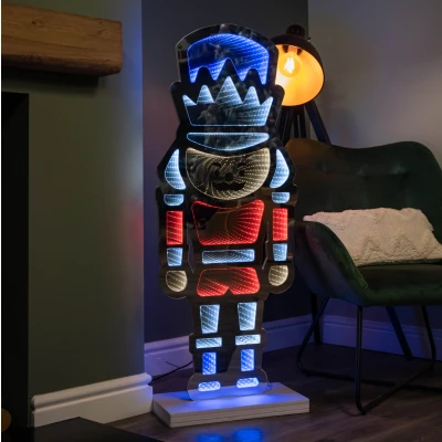 Transform your holiday decor with this tall standing Nutcracker infinity led light decoration. Infinity lights are a modern mirror effect using light to create an illusion of depth and a repeating light pattern. This simple yet mesmerising light up display is thin whilst creating this amazing 3D effect as you view of the nutcracker from different angles. Create a festive display and a talking point for all your family and guests. Suitable to be placed on most flat surfaces such as a mantle piece, windowsill or by the front door to welcome visitors this year. Featuring an infinity mirror with Red, White and Blue LEDs, this creates the never ending reflection of the nutcracker when lit up. The decoration sits on a metal base and is mains operated with a generous 3m clear cable from product to plug. Quick and easy to set up, just simply peel the film off the mirror then attach the base and plug in. Suitable for indoor use only. Product Dimensions Height: 120cm Length: 47cm Stand: 44 x 25cm Cable Length 5m