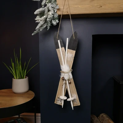 Bring the feel of a Winter ski resort escape to your home this year with this attractive set of skis'. This decoration will look great part of a grand display or on it's own whether you choose to hang this in the living room above the fireplace or in the hallway this is sure to grab the attention this piece deserves. Featuring a pair of ski boards with a Black trim and White ski poles bound together with a White fur material and securely tied with rope and bells. The ski boards also features a Silver snowflake detail at the bottom. Made from wood this decoration offers the rustic feel and comes with a rope hanging hoop allowing to hang this anywhere you like within you home or ski lodge! Suitable for indoor use only. Product Dimensions: Length 55cm 19cm Wide.