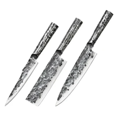 The Samura Meteora Set of 3 Kitchen Knives include a 6.9 utility knife, a 6.8 nakiri knife and a 8.2 chef's knife. Perfect for gifting in the stylish box or as a great starter set for home.Crafted from individual pieces of steel through hand forging, Meteora knives capture the rugged beauty of outer space. Their otherworldly design appeals to cooking enthusiasts seeking to make a distinctive statement.These knives are meticulously balanced and undergo convex sharpening, guaranteeing superior cutting performance across a variety of tasks and are expertly balanced and sharpened with a convex edge, delivering outstanding cutting precision across a range of ingredients.The Meteora range is perfect for adventurous cooks who desire high-performance tools that mirror their bold approach to cooking.  Knives are not for sale to persons under the age of 18. - all knives and bladed products are delivered by Age Verified Delivery (AVD). The carrier may request proof of age in order to deliver your parcel. If proof of age is not available, or the recipient is underage, the carrier will refuse to deliver.