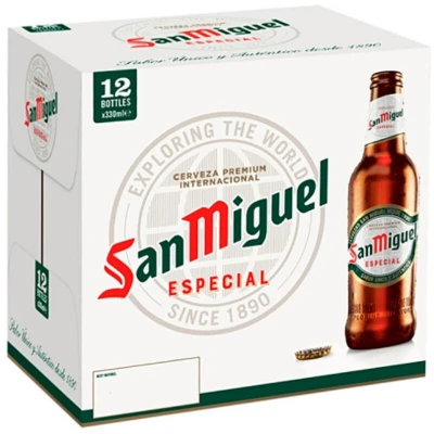 San Miguel Especial Premium Lager 12Pk 330ml 5% is a crisp, refreshing Spanish lager with a 5% ABV, brewed with premium barley malt, hops, and maize. Enjoy its balanced, smooth taste—perfect for any occasion. Contains barley; suitable for those over 18.