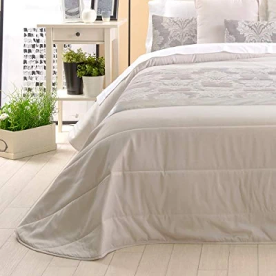 Quilt ideal for cold weather, 100% polyester, size 180 x 265 cm, for 90 cm bed Made of jacquard, high density siliconised acrylic wadding filling, 250 g/m². Insulating and breathable, feels soft and comfortable. Washable at max. 40°C, normal wash, iron at low temperature. The cushions are not included.