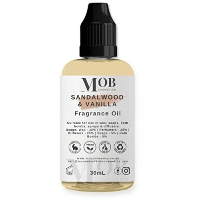 Sandalwood and Vanilla Luxury Designer Fragrance Oil Highly Concentrated Perfect for Candles, Soaps, Bath Bombs, Diffusers, Wax Melts UK Made Vegan (Sandalwood Vanilla, 30ml)