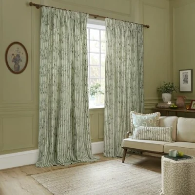 Sanderson Chinese Lanterns Room Darkening Pencil Pleat Curtain Pair Floral Embroidered Striped Lined Drapes (Sage 229x229cm)