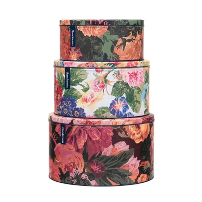 General description The Sanderson Very Rose & Peony Set of 3 Round Cake Tins are perfect for storing your homemade bakes, cakes, and biscuits. This lovely set showcases illustrations of dramatic floral blooms with a strong contemporary design, making them ideal for your homemade treats. Technical specifications Large Tin: 14.5(H) x 24.5(Dia) cm Medium Tin: 12(H) x 22.5(Dia) cm Small Tin: 9(H) x 20(Dia) cm