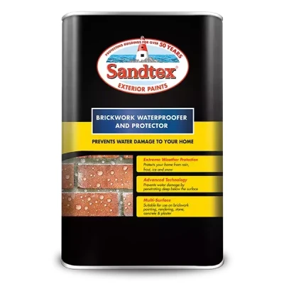 General description Sandtex Brickwork Waterproof Protector - Clear - 5L is a ready-to-use silicone-based formulation designed for application onto porous surfaces. It forms a water-repellent barrier that protects against the damaging effects of rain, frost, ice, and snow. The advanced technology ensures that while moisture is kept out, the surface retains its natural permeability, allowing it to breathe and dry out under normal conditions, thus reducing the likelihood of destructive frost damage. Technical specifications Formulation: Silicone-based Appearance: Dries to form a clear, invisible coating Drying Time: Touch dry in 4 - 6 hours Usage Preparation: Ensure surfaces are clean and free from loose material. Application: Apply the first coat using a brush. Apply a second coat within 1 hour of the first. Allow 4 - 6 hours to dry completely.