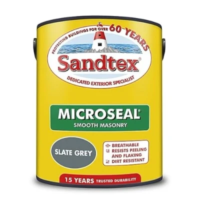 General description Sandtex Microseal Smooth Masonry Paint is designed to protect and beautify your home. Engineered with advanced microporous technology, this paint forms a seal against water ingress while allowing surfaces to breathe, ensuring long-lasting protection and a stunning finish. Technical specifications Volume: 2.5L Coverage: 12-16 square meters per litre Drying Time: Touch dry in 3-4 hours; re-coat in 3-4 hours Number of Coats: Apply 2 coats for optimal protection and finish Compatibility and accessories Suitable for application by brush, roller, or spray Ideal for use on most sound, dry exterior surfaces including render, roughcast, pebbledash, concrete, building blocks, facing bricks, and previously painted surfaces Not suitable for use on common, Fletton, or engineering type bricks Usage Mould & Algae Resistant: Advanced formulation protects against mould and algae growth Dirt Resistant: Helps maintain a clean and aesthetic appearance Rainproof in Just 1 Hour: