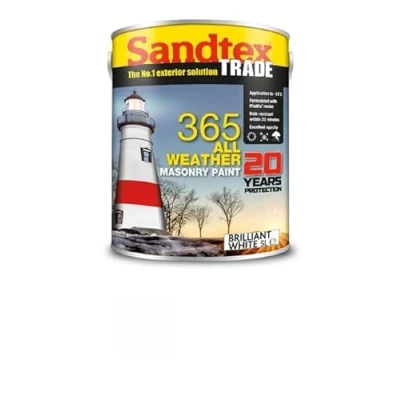 Sandtex Trade 365 All Weather Masonry Paint Ensure your exterior surfaces withstand the toughest conditions with Sandtex Trade 365 All Weather Masonry Paint. Formulated with high-performance Pliolite resins, this exceptional paint provides up to 20 years of protection and can be applied even in temperatures as low as -10°C. With shower resistance after just 20 minutes, you can rely on Sandtex 365 for all-weather durability. Key Features: 20 Years' Protection : Long-lasting coverage ensures your surfaces remain protected for decades. Application in Low Temperatures : Can be applied in temperatures as low as -10°C, making it ideal for adverse weather conditions. High Performance Pliolite Resins : Ensures robust adhesion and durability. Quick Shower Resistance : Resistant to showers just 20 minutes after application. Coverage & Application: Number of Coats : Apply 2 coats for maximum durability and protection. Drying Time : Touch dry in 1-2 hours; ready for recoat in 16 hours.