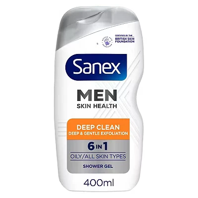Sanex Men Skin Health Deep Clean Shower Gel 400ml x 6, Oily Men’s Body Wash, Reduces Oil, Removes Dirt, Gently Exfoliates, Protects from Pollution, 6 in 1 Benefits, Dermatologically Tested