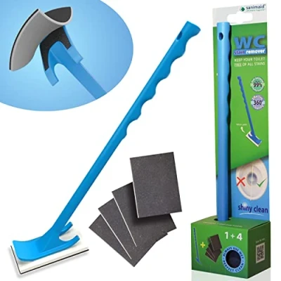 Experience an Extraordinary Clean: toilet stain remover is your ultimate solution for achieving a shiny, spotless toilet. say goodbye to limescale and stubborn stains, as this remarkable tool effortlessly tackles them all Hassle-Free Cleaning: With our starter kit, you'll receive WC Stain Remover tool and 4 flexible cleaning pads. Thanks to the convenient velcro on the back of each pad, they can be easily exchanged whenever needed. Wave goodbye to messy hands and say hello to a hygienic and hassle-free cleaning experience Unleash the Power of Microban: Our toilet cleaner features built-in anti-bacterial technology from Microban. This innovative addition not only helps remove stains but also provides an extra layer of cleanliness and protection, ensuring a healthier environment for you and your family Say Goodbye to Expensive Cleaning Products: With limescale remover toilet, you can save your hard-earned money. No longer will you need to invest in pricey cleaning products. This incredible tool works its magic without the need for any additional cleaners, making it both cost-effective and eco-friendly Reach Every Corner with Ease: The WC Stain Remover's flexible pads are designed to reach every nook and cranny of your toilet, including those hard-to-reach areas under the rim. Experience a thorough clean like never before, and enjoy the peace of mind that comes with a sparklingly fresh toilet bowl