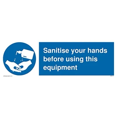 M913 : Use hand sanitiser This sign is made from vinyl high tack A stickier sticker. Uses a stronger adhesive to make it more suitable for plastic surfaces like Wheelie Bins or where the sticker might get rubbed. 31 landscape Sign Text: Sanitise your hands before using this equipment