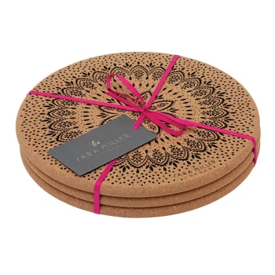The Sara Miller Artisanne Noir Set of 3 Cork Trivets features a monochrome mandala design on a an eco-friendly cork material.Ideal for placing hot pots and plates on to keep your table or work surface protected from scolds and burns.These round trivets are part of the Sara Miller Artisanne Noir collection and can be matched with other items from the collection, sold separately.Size: 1.7(H) x 17(W) x 44(L)cm.