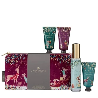 An elegant, soft velvet zippered pouch with playful woodland animals containing four richly scented Peony, Bergamot and Amber body mist, body wash, body cream and foot cream. A perfect giftable body care ritual in handy travel sizes. Cleanse and soften with the body wash with bamboo extract and indulgent body cream with shea butter, glycerin, hyaluronic acid and meadowfoam seed oil. Intensive care for tired feet, a rich refreshing foot cream with shea butter and menthol and opulent scented body mist completes this set. Fragrance notes: imagine the brightness of bergamot and delicate, just-picked peony combined with the mellow sweetness of amber and cedarwood. Each product is scented with the modern alluring floral fragrance. Designer details: Sara Miller make-up bag with zip finished with a golden zip pull. Sara Miller celebrates the festive season with Woodland Tales featuring playful woodland characters. Cruelty free and vegan friendly.