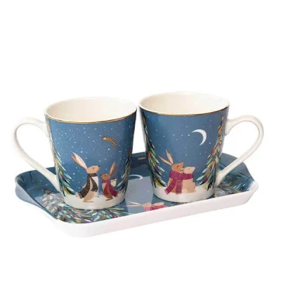 Unwrap a touch of heartwarming charm with this delightful Mug and Tray Set from the Sara Miller London Woodland Tales collection.The set includes two porcelain mugs adorned with a sweet design of rabbits, snuggling under a moonlit sky and enhanced with 22ct gold around the top of the mug. Matched with a melamine tray with the same design.Designed in the UK.Dimensions: 8.5(H) x 14.5(W) x 23(D)cm.