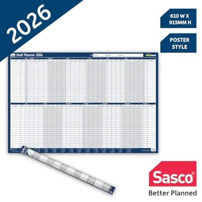 NEW & IMPROVED ACCESSORY KIT – 392 stickers including 244 icon dots and148 sticker strips, that help you highlight holidays, meetings, deadlines, and more with ease; Plus, Wet wipe marker with pen clip, so your pen is always at hand; TRACK STAFF AVAILABILITY – Runs January to December 2026 with space for up to 40 staff or projects DETAILED WEEKLY LAYOUT – Year divided into two 6-month blocks with daily columns for easy scheduling PRINTED & LAMINATED FOR REUSE – High-quality 130gsm paper with laminated finish for wipe-clean updates SUPPORTS YOUNGMINDS CHARITY – Every purchase helps fund mental health support for children and young people in the UK CONTENTS: x1 Delivered Rolled – 2026 Calendar UK, great for HR teams and offices – 2410276