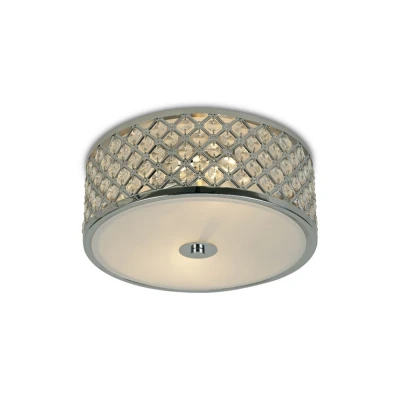 The focal point of this collection is certainly the vast amount of clear button glass crystals, that make these round flush light fittings truly unique.The crystals are fixed within the intricate framework shaped to reflect small diamond patterns. The 2 x E14 lampholders are concealed by a sleek opal glass diffuser. This range is available in both a polished chrome and antique brass finish.
