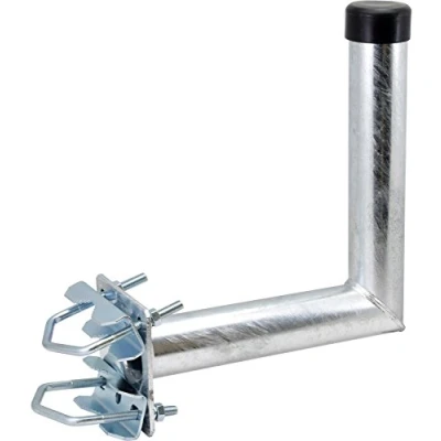Bracket for mounting a satellite dish or aerial antenna to a vertical pipe up to max. 60 mm Ø Pole boom with 25 cm distance and pipe 48 mm diameter Non-rotating attachment with claw clamps Material: hot-dip galvanized steel, galvanized U-bars