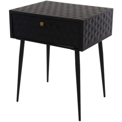 General description Strong, sturdy, and stylish, the Saturn 1 Drawer Bedside Cabinet is crafted entirely from metal and features a sleek black finish complemented by a contrasting gold effect handle. The drawer unit showcases a unique honeycomb design pressed into the panels, creating a striking three-dimensional effect. The interior of the drawer is also made from metal with a painted finish and is equipped with easy glide metal runners. The cabinet is supported by mid-century styled tapered metal legs, making it an ideal choice for use as a bedside or side table. Technical specifications Dimensions: L35.8 x W46 x H56.2 cm Weight: 6.5 kg Drawer dimensions: L325 x W382 x H100 mm Drawer front thickness: 0.5 mm Drawer sides & back thickness: 0.5 mm Drawer base thickness: 0.5 mm Leg dimensions: L25 x W25 x H404 mm Product cube: 0.0926 Installation Minimal assembly required Supplied with fully detailed assembly instructions Tools for assembly included Usage Can be used as a bedside table