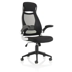 Striking mesh back, airmesh seat design. Single lever rock and lock mechanism. Flip back arms for closer at desk work. Lumbar support pressure pad. Tension controlled tilt. Pyramid base. Generous airmesh headrest. Silver accented armature styling.