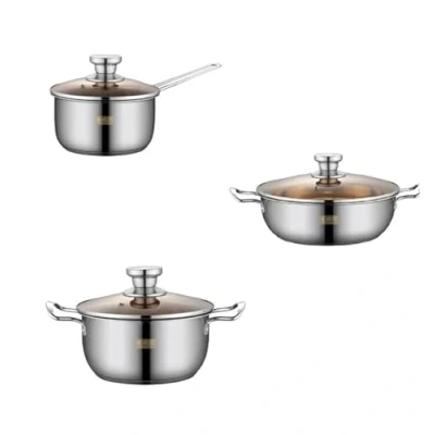 Sauce Pan Set 3pc Stainless Steel with Glass Lids Korean Style Sheng New