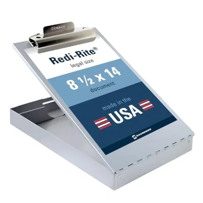 High-capacity steel clip with self-locking latch and credit/ID card holder can securely hold up to 150 sheets of 20lb paper; stay organized so you can get the job done. Top opening design with 1. 5" internal storage capacity; Lightweight aluminum base provides a sturdy writing surface while on the go or away from a desk. Storage compartment keeps sensitive information protected from prying eyes; Use this clipboard to complement your HIPAA privacy program. Made from 89% recycled aluminum with a minimum of 30% post-consumer recycled content; Assembled in USA from domestic, globally sourced components Clipboard measures 16. 25" x 9 in. x 2. 75 in. (L x W x H) when placed on the table; can fit documents and shapes up to 8. Size: 5" x 14"