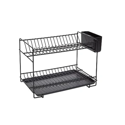 Dish drainer on two levels, with capacity for 18 dishes. Made of steel with black anti-corrosion plastic coating (resin). This cover offers long-lasting protection against corrosion, bumps and scratches, inclement weather and other pollutants. Dimensions: 38.5 x 25 x 28 cm. Domestic manufacture. With water tray in black plastic, very practical if you want to use the dish drainer on top of a furniture. With black plastic wrap.