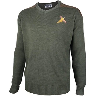 Acrylic wool jumper with suedlite shoulders V-neck - ideal for wearing a shirt and tie underneath Embroidered pheasant logo Chest Size (approx): Small - 36", Medium - 38", Large - 40", XL - 42", XXL - 44", XXXL - 46"
