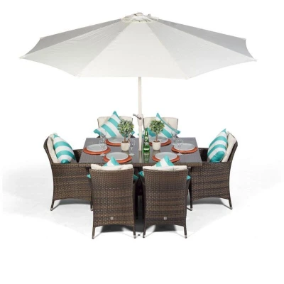Savannah Rattan Dining Set Rectangle 6 Seater Brown Outdoor Poly Garden Table & Chairs Patio Conservatory Wicker Furniture with Parasol Cover