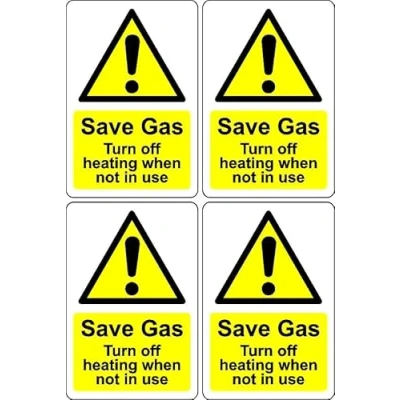 Save Gas turn off heating when not in use energy saving sign Self adhesive stickers 100mm x 66mm Pack of 4 stickers Digitally printed and laminated for extra durability Remove backing film and apply to dry smooth oil free surface