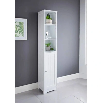 General description This stylish contemporary bathroom storage cabinet features a tallboy design with a clean white wooden finish, making it perfect for bathrooms, cloakrooms, or any space needing extra shelving and concealed storage. With three open shelves and one door cupboard, it offers a practical solution for organizing towels, toiletries, and decorative items while enhancing your bathroom decor. Technical specifications Item Dimensions: 30 x 30 x 160 cm Package Dimensions: 16 x 84 x 34 cm Material: Durable MDF construction Usage Ideal for storing toilet paper, soaps, towels, and bathroom accessories. Can be used to display decorative pieces while keeping smaller items concealed.