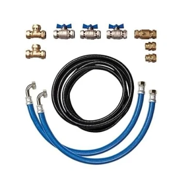 The 15mm Standard Fitting Kit includes two 3-way valve tees, single valves, a non-return valve, and two plastic hoses with metal fittings, all with a nominal 10mm bore. The Combi Fitting Kit offers a 13mm bore and features three valves, two tees, a non-return valve, and two metal braided hoses with metal fittings. The 22mm Hi Flow Fitting Kit, with a 19mm nominal bore, includes three valves, two tees, a non-return valve, two 22mm to 3/4 adaptors, and two braided hoses with metal fittings. Additionally, the 22mm Hi Flow Hoses set includes two braided hoses with a 19mm nominal bore and metal fittings.. Scalemaster Fitting Kits & Hoses Scalemaster 22mm Hi Flow Fitting Kit