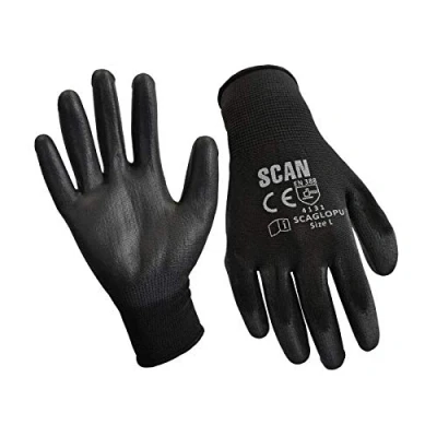 AmazonThese Scan Black PU Coated Gloves are made from knitted nylon with a seamless finish and a fine polyurethane coating over the palm and fingers The back of the glove is uncoated to provide ventilation to the hand avoiding perspiration and clamminess Typical application include packing, inspection and fine component assembly operations