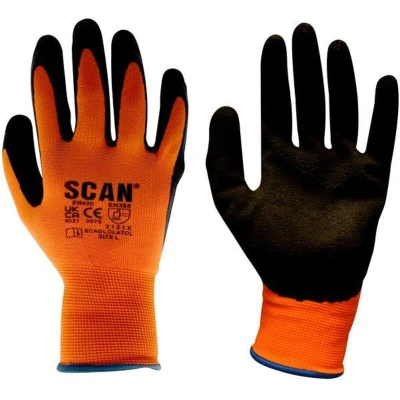 General description Scan Hi-Vis Orange Foam Latex Coated Gloves are designed for enhanced grip and flexibility in various conditions. Made from seamless knitted polyester, these gloves feature a black latex wrinkle finish coating on the palm and fingers, ensuring excellent comfort and performance in both wet and dry environments. Technical specifications Size: XL (Size 10) Type: Latex coating Material: Seamless knitted polyester with foam latex coating Standards: Conforms to EN420 and EN388:2016 Performance indices: Abrasion 2, Blade Cut 1, Tear 2, Puncture 1 Compatibility and accessories Designed for general hand protection during DIY, construction, and home improvement projects. Installation Simply select the appropriate glove size and wear for protection during tasks requiring grip and dexterity. Usage Ideal for handling tools, materials, and equipment in wet or dry conditions. Provides good grip, flexibility, and comfort for various manual tasks. Other information