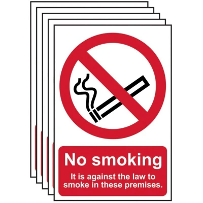 General description This durable PVC safety sign measures 200 x 300mm and clearly indicates that smoking is not allowed on the premises. It features easy-to-read text and illustrations to communicate the message effectively, helping to ensure safety compliance and reduce liability in the workplace. Technical specifications Material: 1mm thick PVC Size: 200 x 300mm Message: "No smoking. It is against the law to smoke on these premises" Print: UV resistant inks for fade resistance Compatibility and accessories Suitable for indoor and outdoor use on various wall surfaces Adhesive: Water-based, aggressive adhesive for secure attachment Installation Easy to install using the built-in adhesive backing Ensure the surface is clean and dry before application for best adhesion Usage Place in visible locations to inform and remind staff and visitors of the no smoking policy Use in workplaces, public buildings, and other areas where smoking is prohibited Other information Complies with BS5499 and