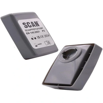 These Scan Twin Half Mask P3R Particle Filter Cartridges are suitable for use with the Scan SCAPPERESPMO 1/2 mask respirator and SCAPPERESPFF full face respirator. Used to protect against particles such as dust, smoke andaerosols. They filter out up to 99.95% of contaminants. The glass fibre and polyporpylene material ensure a high performance and reusable filter. Supplied as a pack of 2 filter cartridges. Conforms to EN 143:2021.