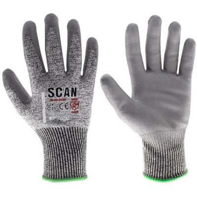 General description Scan Safety Cut D Gloves are designed with polyurethane-coated palms and fingers, providing excellent grip and protection for handling various materials. These gloves are ideal for general handling, warehouse applications, and tasks involving sharp objects. The Cut D liner enhances their resistance to cuts and tears, making them suitable for environments where blades and other sharp tools are present. Additionally, 16% of the liner is made from recycled polyester, promoting environmentally friendly practices. Technical specifications Size: Large (Size 9) Material: Polyurethane coating with Cut D liner Standards: EN388 Mechanical hazard ratings - Abrasion 4, Blade Cut 4, Tear 3, Puncture 3, Cut D Compatibility and accessories Suitable for handling sharp tools and materials Installation Put on the gloves ensuring a snug fit for optimal protection and dexterity Usage Ideal for general handling, warehouse tasks, and work involving blades or sharp objects
