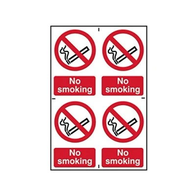 General description This safety sign indicates a no smoking area. Made from durable 1mm thick PVC, it features clear instructions and illustrations to ensure visibility and understanding. The sign is printed with UV-resistant inks to prevent fading and is designed for easy adhesion to walls using an aggressive water-based adhesive. It helps promote safety compliance and can reduce liability in the workplace. Technical specifications Material: PVC, 1mm thick Individual Size: 100 x 150mm Sheet Size: 200 x 300mm Message: "No smoking" Print: UV-resistant inks for durability and fade resistance Compatibility and accessories Suitable for indoor use on various wall surfaces Can be used with compatible mounting accessories if needed Installation Ensure the surface is clean and dry before application Peel off the backing and press firmly onto the desired surface Hold in place for a few seconds to ensure adhesion Usage Place in visible locations to indicate no smoking zones Use in workplaces,
