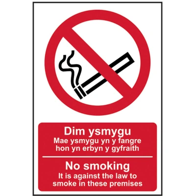General description This Scan Safety sign is designed to effectively communicate the message of 'No Smoking' in both English and Welsh. Made from 1mm thick, durable PVC, it features clear, easy-to-read text and illustrations, ensuring long-lasting visibility and resistance to fading. The sign is suitable for various environments, making it an essential addition to promote safety and compliance with legal requirements. Technical specifications Material: PVC Thickness: 1mm Size: 200 x 300mm Printing: UV-resistant inks Adhesive: Water-based, aggressive for secure attachment Compatibility and accessories Suitable for indoor and outdoor use on walls and flat surfaces No additional accessories required for installation Installation Ensure the surface is clean, dry, and smooth before applying the sign Peel off the backing of the adhesive and press firmly onto the desired surface Hold in place for a few seconds to ensure proper adhesion Usage Use to indicate no smoking areas in compliance