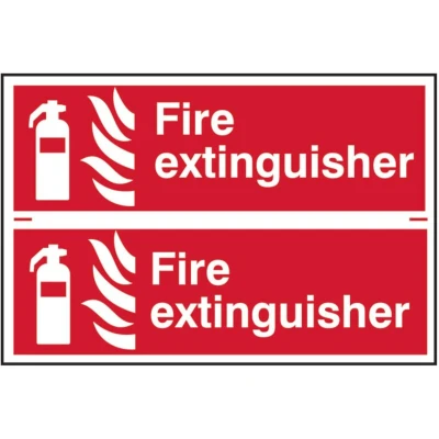 General description This is a durable, self-adhesive PVC sign indicating the location of a fire extinguisher. It features clear, high-visibility graphics and complies with safety standards to help prevent accidents and limit liability. Technical specifications Material: 1mm thick PVC Individual Size: 300 x 100mm Total Sheet Size: 200 x 300mm Color: White with red background and white text/symbols Printing: UV resistant inks to prevent fading Adhesive: Aggressive water-based adhesive for secure attachment on smooth, dry surfaces Compatibility and accessories Designed for application on smooth, dry surfaces such as walls and doors Installation Ensure the surface is clean, dry, and free of dust or grease before application Peel off the backing and press firmly onto the desired surface to ensure good adhesion Usage Use this sign to clearly mark the location of fire extinguishers in workplaces, public buildings, or industrial areas Ensure the sign is visible and unobstructed for quick