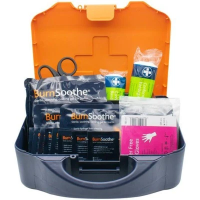 General description The Scan Burns Kit offers efficient treatment for burns, scalds, and sunburn injuries that can occur in both workplace and domestic environments. This comprehensive kit is well-suited for a wide range of industries and aligns with the guidelines of the Health and Safety Executive. It is organized in an orange integral aura box for easy access and portability. Technical specifications 1 x Burnsoothe Burn Relief Dressing 20 x 20 cm 2 x Burnsoothe Burn Relief Dressing 10 x 10 cm 1 x Burnsoothe Burn Relief Dressing 5 x 15 cm 8 x Burnsoothe Burn Blot Sachet 3.5 g 1 x Burnsoothe Burn Relief Gel Bottle 125 ml 1 x Small Universal Shears 150 mm (6 in) 1 x Pair of Religlove Nitrile Powder-free Gloves Medium/Large 1 x Reliform Conforming Bandage 7.5 cm x 4 m 1 x Reliform Conforming Bandage 10 cm x 4 m 1 x Reliance First Aid Guidance Leaflet Compatibility and accessories Suitable for treating various burn types and sizes Includes essential first aid accessories such as gloves,
