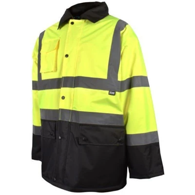 General description This Scan Hi-Vis Yellow/Black Motorway Jacket is designed for high visibility and protection against adverse weather conditions. It features a waterproof design with taped seams and retro-reflective tape, ensuring safety in low-light environments. Technical specifications Size: M (41 in) Material: 100% polyester with PVC coating Fabric: 300D polyester shell with 190 polyester taffeta lining Insulation: Quilted liner with polyester wadding Closure: Two-way heavy-duty zip fastening Additional features: Stud fastening storm flap, concealed hood with drawstring, elasticated cuffs and hem Compliance: EN ISO 20471 Class 3, EN343 Class (3.1.X)