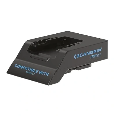 General description The SCANGRIP® CONNECT Dewalt Connector is an intelligent connector designed to adapt 18V/20V batteries from major brands such as Milwaukee, Dewalt, Makita, Bosch, and others for use with SCANGRIP CONNECT work lights. It allows you to power your work light using your existing battery packs, providing a convenient and versatile solution for your lighting needs. Technical specifications Compatible with 18V/20V batteries from various brands Designed for use with SCANGRIP CONNECT work lights Includes a safety system with automatic protection against discharges, overcharges, and temperature control Approved by TÜV Rheinland for safety and quality Compatibility and accessories Compatible with batteries from brands such as Milwaukee, Dewalt, Makita, Bosch, Fein, Festool, Flex, Hazet, Hikoki, Ingersoll, Panasonic, Ridgid, Snap-On, Würth, and Hilti Available connectors for specific battery brands (e.g., BERNER, BOSCH, DEWALT, MAKITA, MILWAUKEE, etc.) Installation Attach the