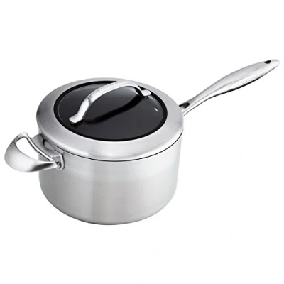 This Scanpan CTX 20cm Saucepan with Lid has a 5-ply multi-layer construction of aluminium and stainless steel for optimum heat distribution without hot spots. Perfect for making sauces and general boiling and simmering tasks. Suitable for all hob types, including induction, this saucepan is also oven proof up to a temperature of 260°C. The Stratanium non-stick coating is PFOA and PFOS-free, metal utensil safe and offers exceptional performance for perfect cooking results. In fact Scanpan's Stratanium non-stick coating is so good it is designed for fat-free frying so you only ever need add oil or fat for flavouring purposes, making it a healthy choice for the kitchen.The stylish brushed steel exterior contrasts beautifully with the black interior. A comfortable, riveted handle transfers very little heat. Complete with helper handle. The stylish steel lid with its glass centre is also oven proof to 260°C. Designed and manufactured in Denmark this 20cm saucepan has a capcity of 3.5L, a height of approximately 15cm (without lid) and a base diameter of 16.5cm. Hand wash recommended.Supplied with a 10 year Scanpan guarantee.