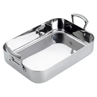The Scanpan Fusion 5 35cm x 24cm Roasting Pan has a 5-layer construction comprising an 18/10 stainless steel outer with an aluminium core. These layers run from rim to rim and through the entire base for fast and even heat distribution and retention. The clean lines of the Fusion 5 collection mean there's nowhere for food to get trapped and being made from stainless steel makes the collection dishwasher safe. The mirror-polished finish will look good in any style of kitchen and details such as two smart stainless steel handles set this range apart from the competition. This 35cm x 24cm stainless steel roasting pan stands approximately 12cm high and is oven proof up to 260°C. Suitable for all hob types including induction. Dishwasher safe.