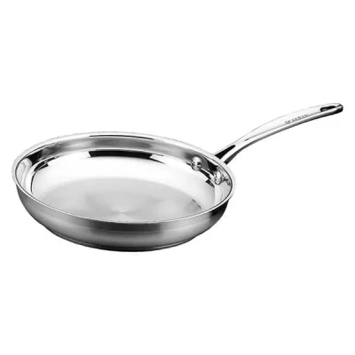 The Scanpan Impact 26cm Frying Pan is made from high quality 18/10 stainless steel for strength and durability.Suitable for use on all heat sources (including induction), this Impact frying pan is also oven proof up to 260°C. The thick 6.4mm sandwich base has an aluminium core to provide excellent heat distribution.As well as looking stylish thanks to its two-tone stainless steel finish, this Impact frying pan features a cast stainless steel handle to prevent transfer and a drip-free rim.This Scanpan Impact 26cm frying pan has a base diameter of 20.4cm and weighs 1.2kg.Dishwasher safe, this Scanpan frying pan is supplied with a 10 year warranty against manufacturing defects.