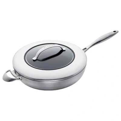 Harts of SturThis Scanpan CTX 32cm Saute Pan with Lid has a 5-ply multi-layer construction of aluminium and stainless steel for optimum heat distribution without hot spots. The high sides to this pan allow for easy sauteing of potatoes and vegetables or browning meat without losing texture and moisture. Suitable for all hob types, including induction, this saute pan is also oven proof up to a temperature of 260°C. The Stratanium non-stick coating is PFOA and PFOS-free, metal utensil safe and offers exceptional performance for perfect cooking results. In fact Scanpan's Stratanium non-stick coating is so good it is designed for fat-free frying so you only ever need add oil or fat for flavouring purposes, making it a healthy choice for the kitchen.The curved sides work well with kitchen utensils and the stylish brushed steel exterior contrasts beautifully with the black interior. A comfortable, riveted handle transfers very little heat. The stylish steel lid with its glass centre is also oven proof to 260°C. Designed and manufactured in Denmark, this 32cm saute pan has a capacity of 4.5L and has a base diameter of 22.8cm. Hand wash recommended.Supplied with a 10 year Scanpan guarantee.