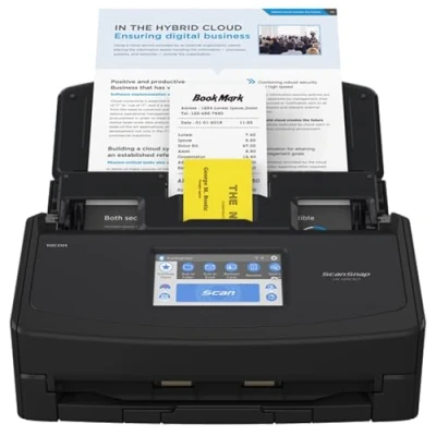 Intuitive touchscreen. Large, 4.3” screen lets you execute scans with one touch (Automated productivity. Scan, optimise, and save up to 50 sheets to the cloud, PC-free) Team efficiency. Colour-coded, pre-defined scanning buttons for up to 5 users Powerful software. Easily search, manage, and retrieve your scanned documents Included Software : ScanSnap Home, ScanSnap Manager, ABBYY FineReader for ScanSnap, Kofax Power PDF Standard / Kofax Power PDF Standard for Mac, ScanSnap Cloud, ScanSnap Connect Application Wi-Fi Interface : IEEE802.11a/b/g/n/ac, 2.4 & 5 GHz, Access Point Connect Mode (Infrastructure Mode) / Direct Connect Mode (Ad-hoc Mode), WEP (64bit / 128bit), WPA (TKIP / AES), WPA2 (AES), WPA-PSK (TKIP / AES), WPA2-PSK (AES), WPS2.0 Image Processing Functions : Automatic: Size Detection, Colour Detection, Cropping, Deskew, Rotation, Blank Page Detection / Deletion. Image Smoothing, Image Emphasis, Error Diffusion, Edge Correction, JPEG Compression, Vertical Streaks Reduction Multi-feed Detection : Overlap detection (Ultrasonic Sensor), Length Detection Scanning Colour Modes : Colour, Greyscale, Monochrome, Automatic Detection (Colour / Greyscale / Monochrome)