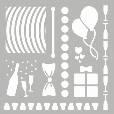 Sweet Dixie party time stencil Designed Exclusively for Personal Impressions by Sharon Balloons bows present champagne glasses Ideal for mixed media Spraying sponging paper-arts card-making chalking & more