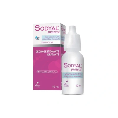 Sodyal Protect is an ophthalmic solution with 0.15% hyaluronic acid, Ginkgo biloba and witch hazel, formulated to lubricate, hydrate and soothe tired eyes. It helps stabilize the tear film and reduce the sensation of dryness or foreign body, also ideal for users Contact lenses or spends a lot of time in closed or air-conditioned environments.
