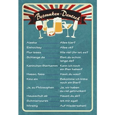 Sheet metal sign made of sheet steel with folded edges With 4 pre-drilled holes for easy installation A great highlight for your home or as a collector's item Size: 20 x 30 cm Motif: "Drunken-Deutsch drinks card" tin sign