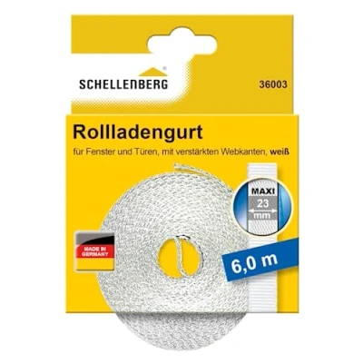 consisting of durable, abrasion-resistant fabric with specially reinforced selvages Used for Maxi systems. Dimensions: 23 mm belt width, 6.0 metres belt length Colour: white, Manufacturer: Schellenberg